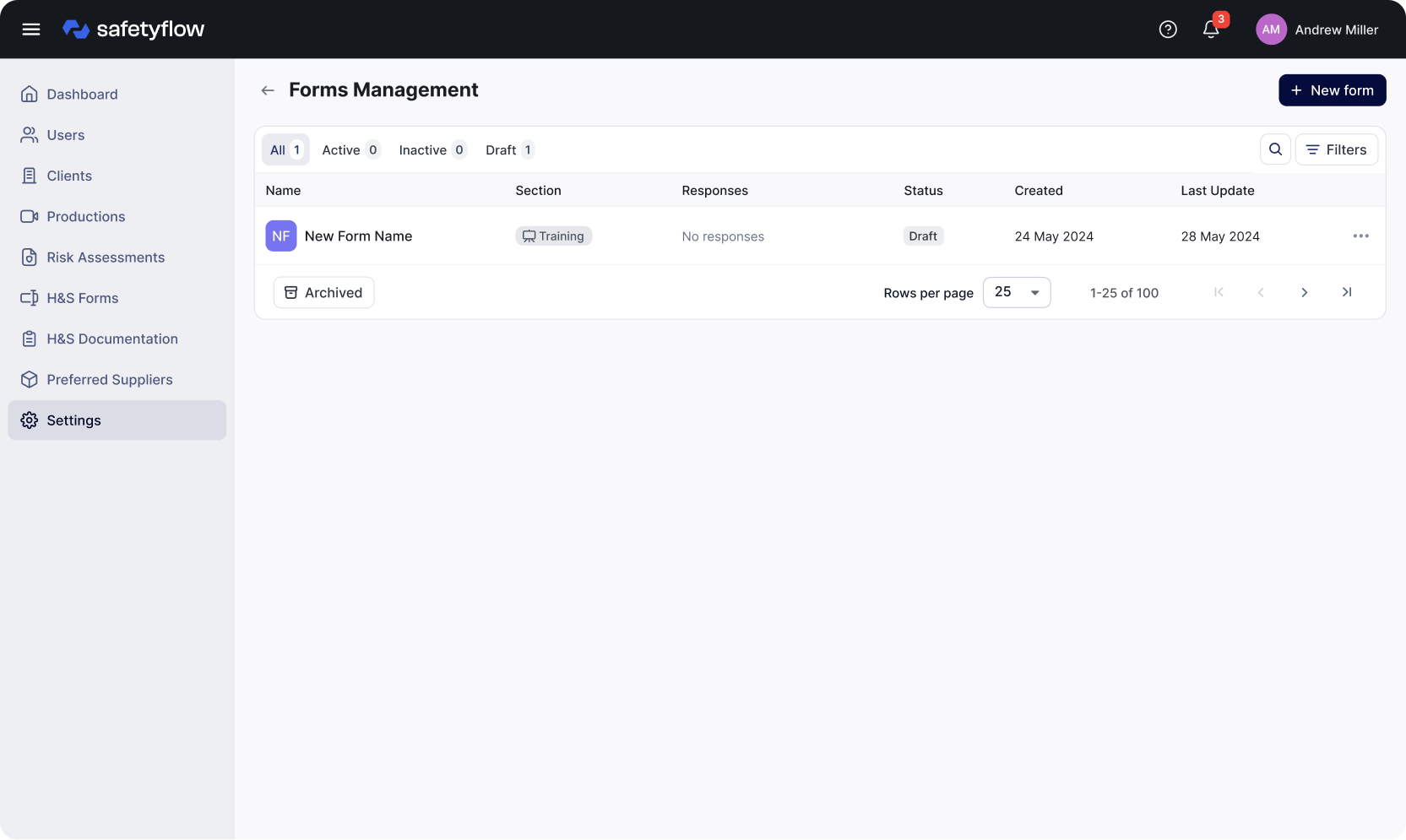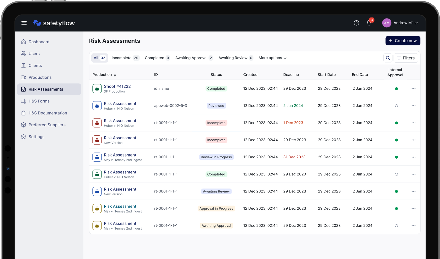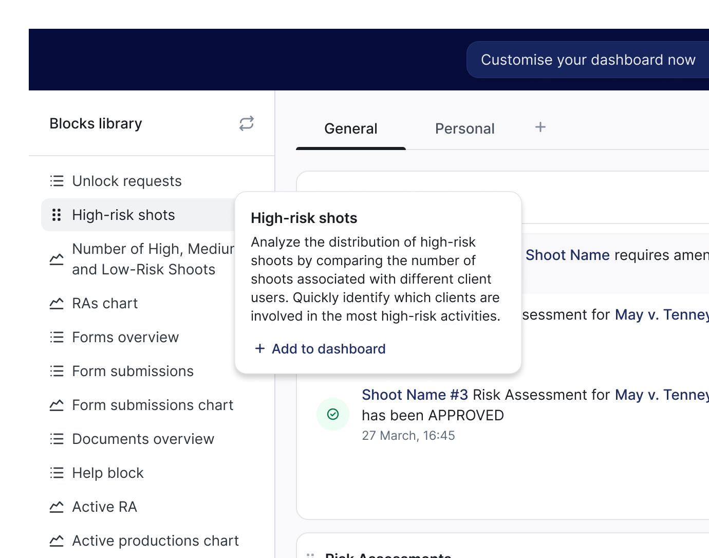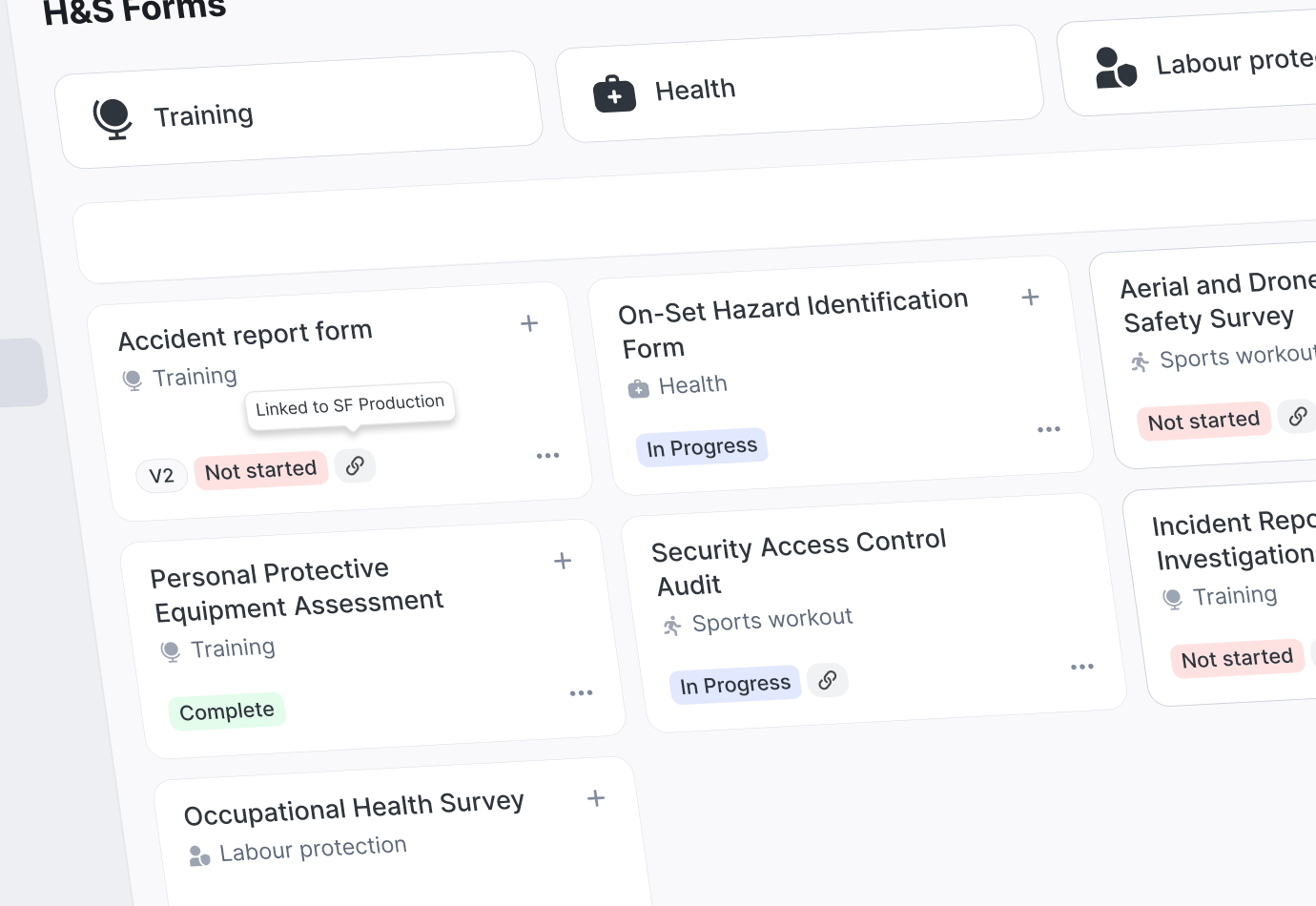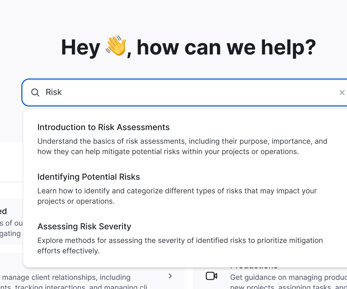 Компаніям потрібна надійна платформа для систематизації та автоматизації процесів управління ризиками на виробництвах, зокрема на знімальних майданчиках. Водночас потрібно забезпечити зручну роботу з формами безпеки під час інспекцій, навчання та аудитів. Головна мета — проста та зручна робота з оцінкою ризиків на знімальних майданчиках і формами зворотного зв’язку, щоб користувачі легко керували всіма актуальними документами через один інтерфейс. Це дозволить контролювати ризики, вести документацію та автоматизувати зв’язок між системами.